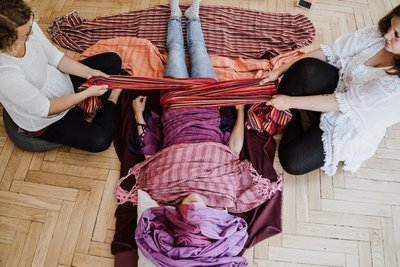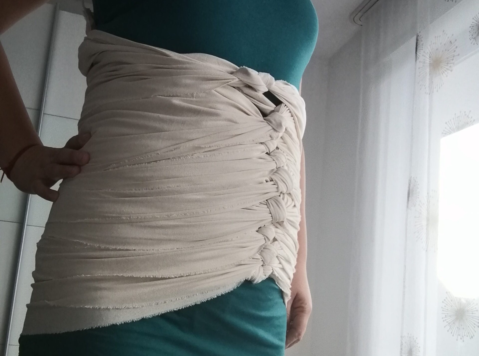 Mit einem 17 Meter langem Tuch wirst du vom Becken aufwärts bis unter die Brust fest aber angenehm gewickelt. Es unterstützt dich im Wochenbett bei der Rückbildung und um wieder deine Mitte zu spüren.